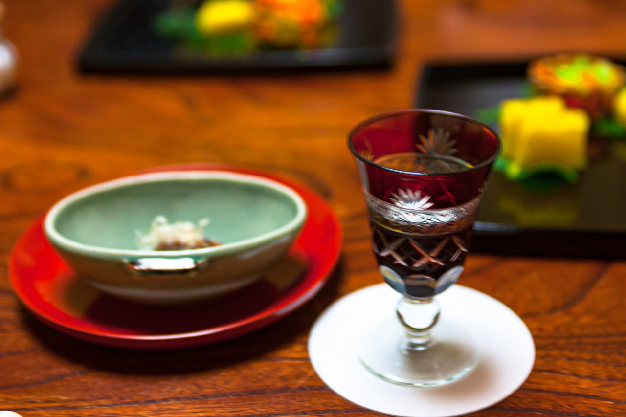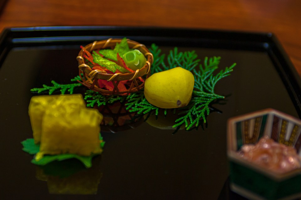 先付けは,秋を感じさせる栗と銀杏。