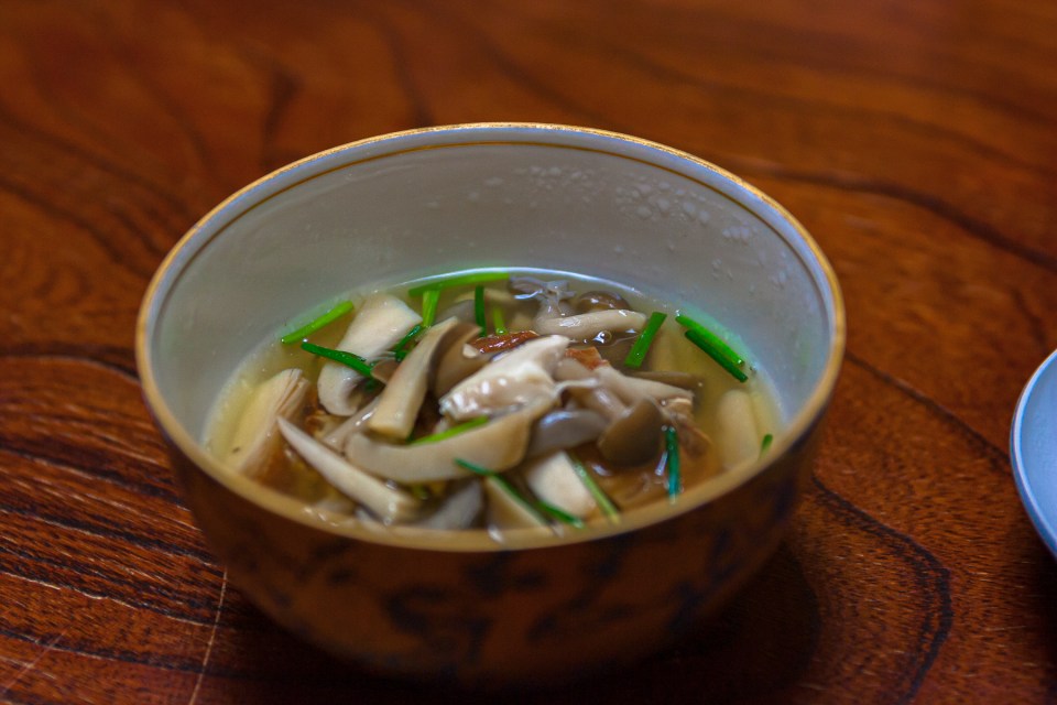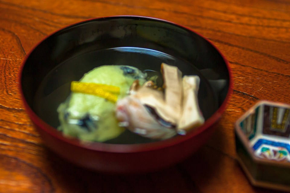 お椀は,松茸。ピントがぴったりあったお出汁です。