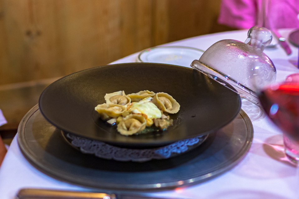 Tortello all’uovo con spinacini e guanciale croccante