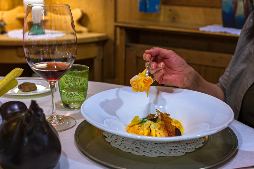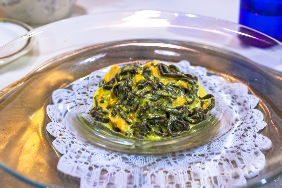 Tagliolini rustico con salsiccia , sottiletta di schiz , porcini e melanzane affumicate e riduzione di birra