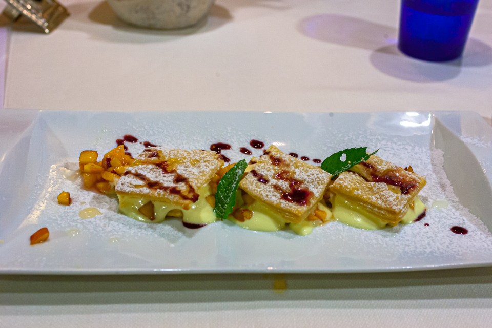 Millefgoglie di pesche con crema ai fiori di sambuco