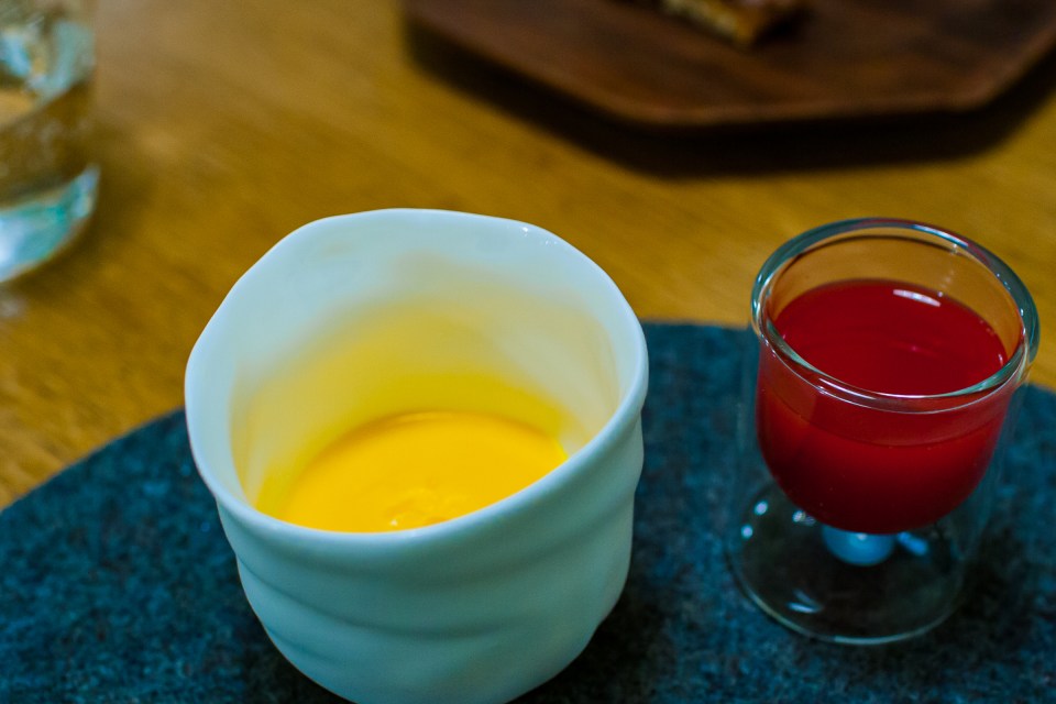 アミューズその1。ベリー系のジュース,そしてキャロットのジュースです。