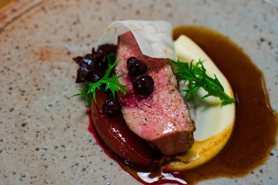 添えてある,洋ナシの赤ワイン煮の甘みが,肉とよく合っています。