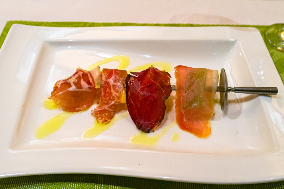 前菜1皿目は,お馴染みの自家製ハムと地元の果物を合わせたもの。