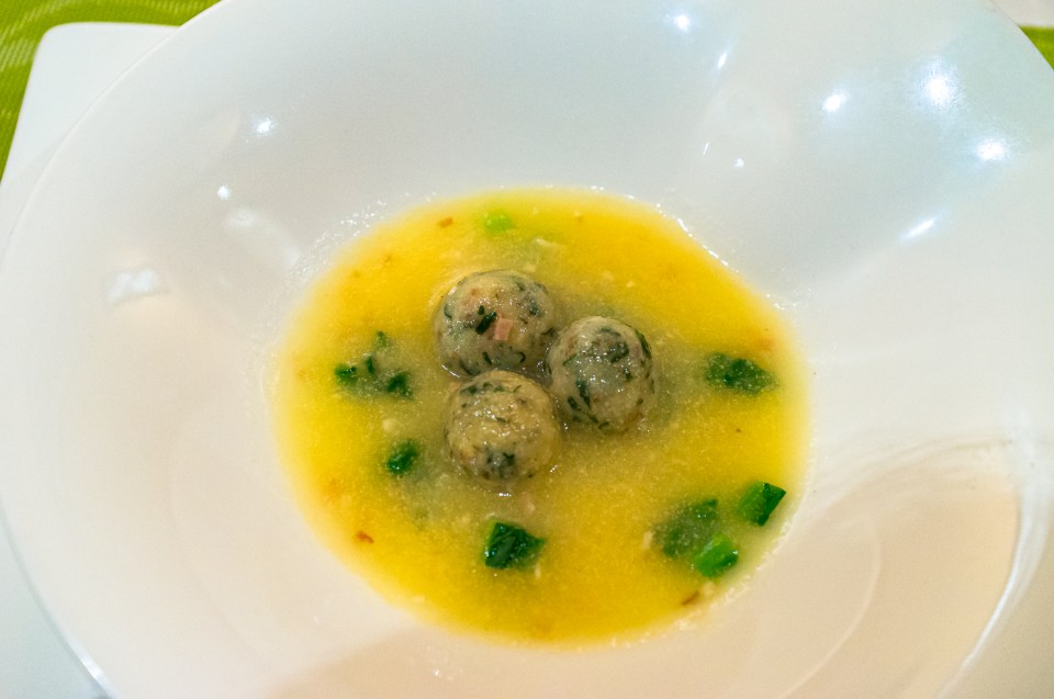 パスタ1皿目は,ポレンタをお団子状にして浮かべたスープ。