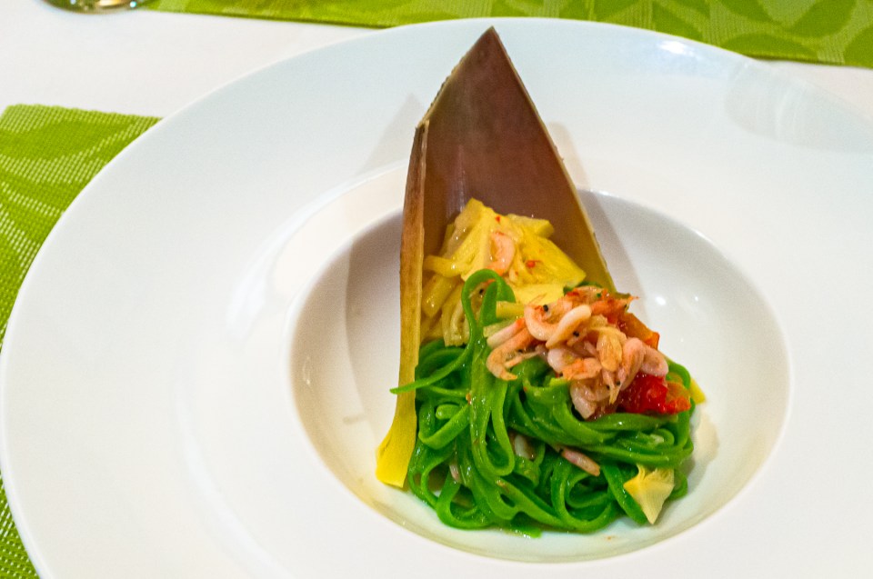 パスタ2皿目は,桜海老と孟宗をつかった,小松菜を練り込んだパスタです。
