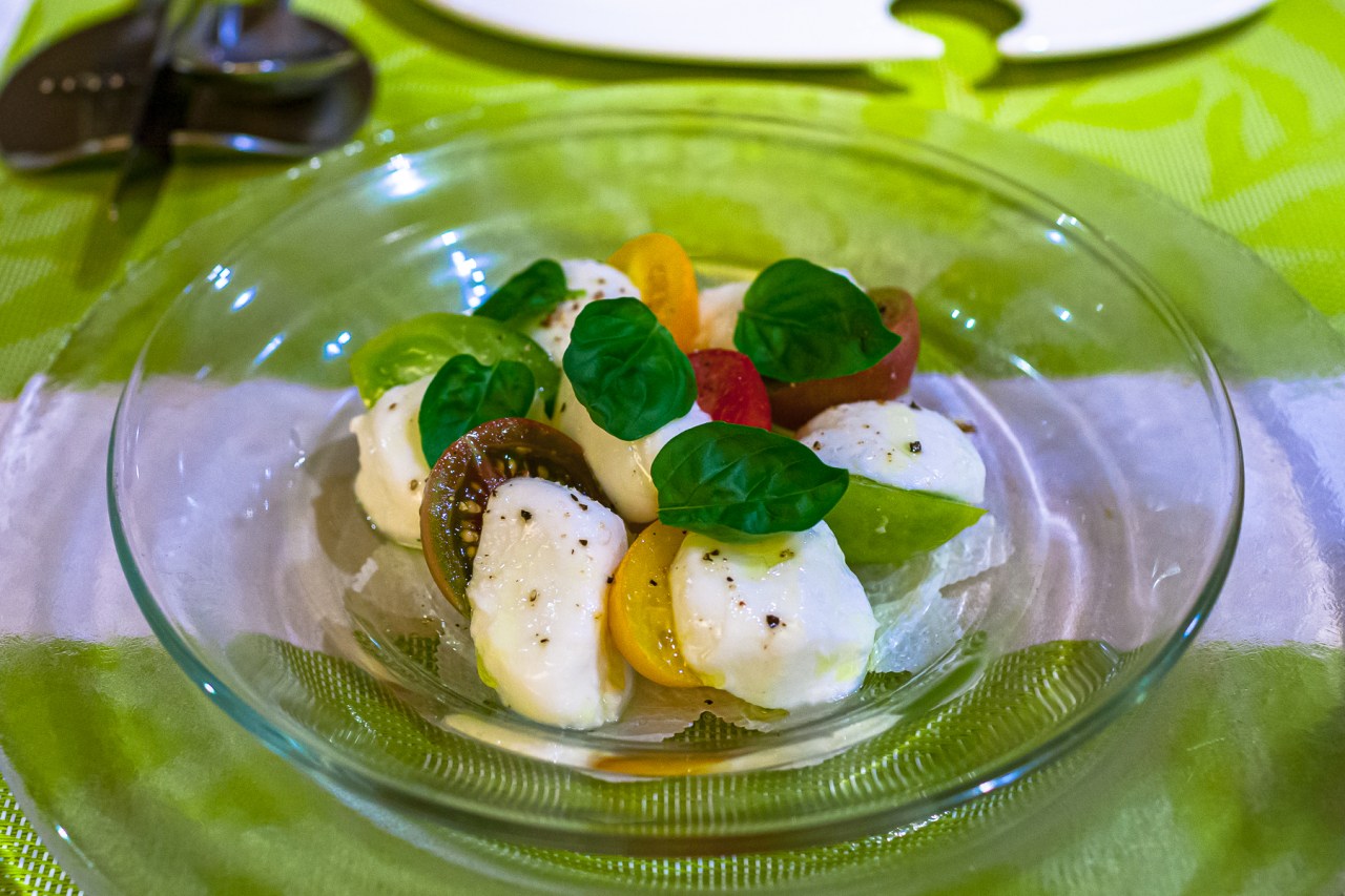 1皿目はカプレーゼ。トマトはおいしそうだけど,モッツアレラはさほど。
