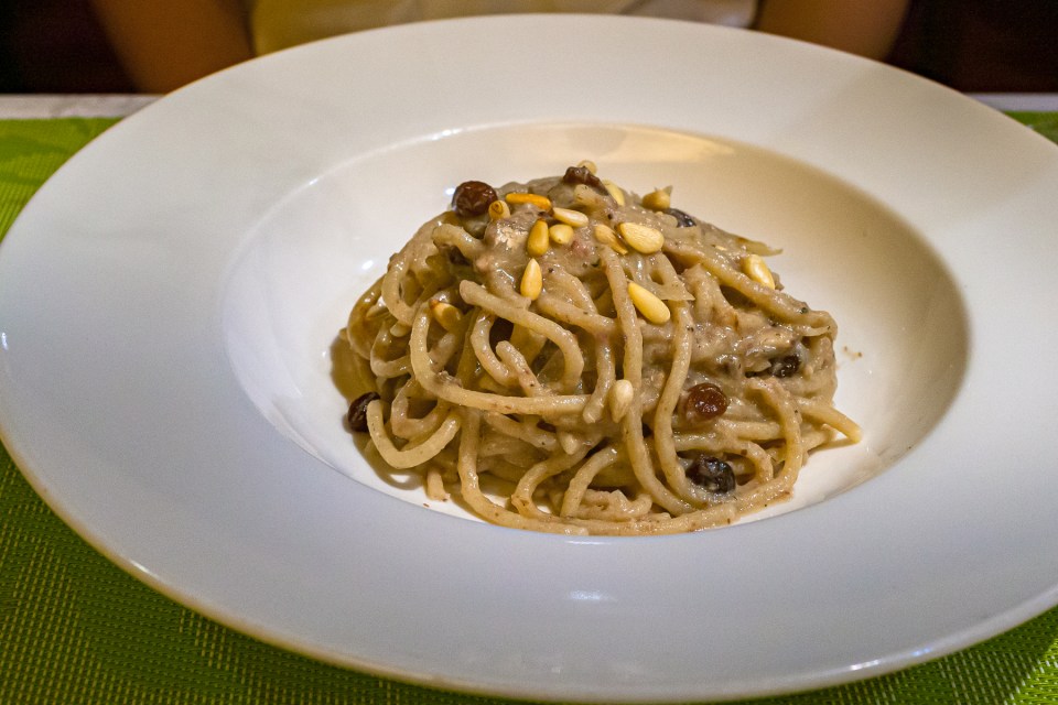 4皿目は,ビーゴリ・イン・サルサ(Bigoli in Salsa)。たまねぎとアンチョビのパスタだけど。