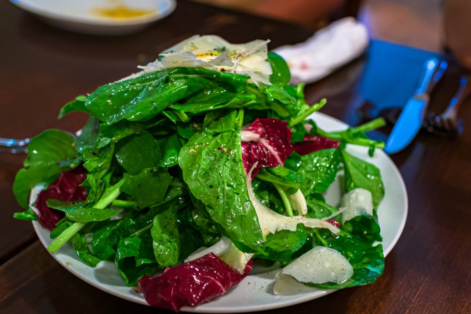 ルッコラにパルメジャーノ・レッジャーノのスライスが載ったサラダ。
