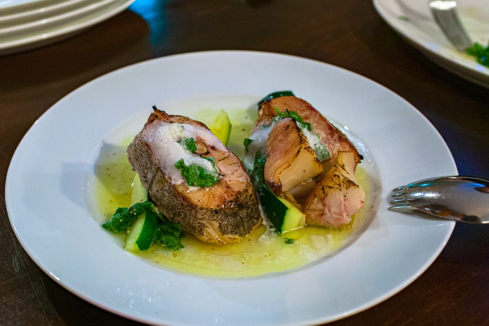コンフィした後に焼き上げた魚にズッキーニを合わせて。