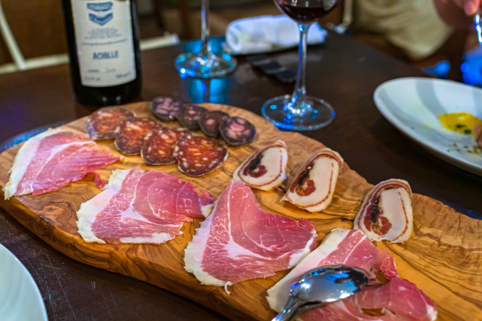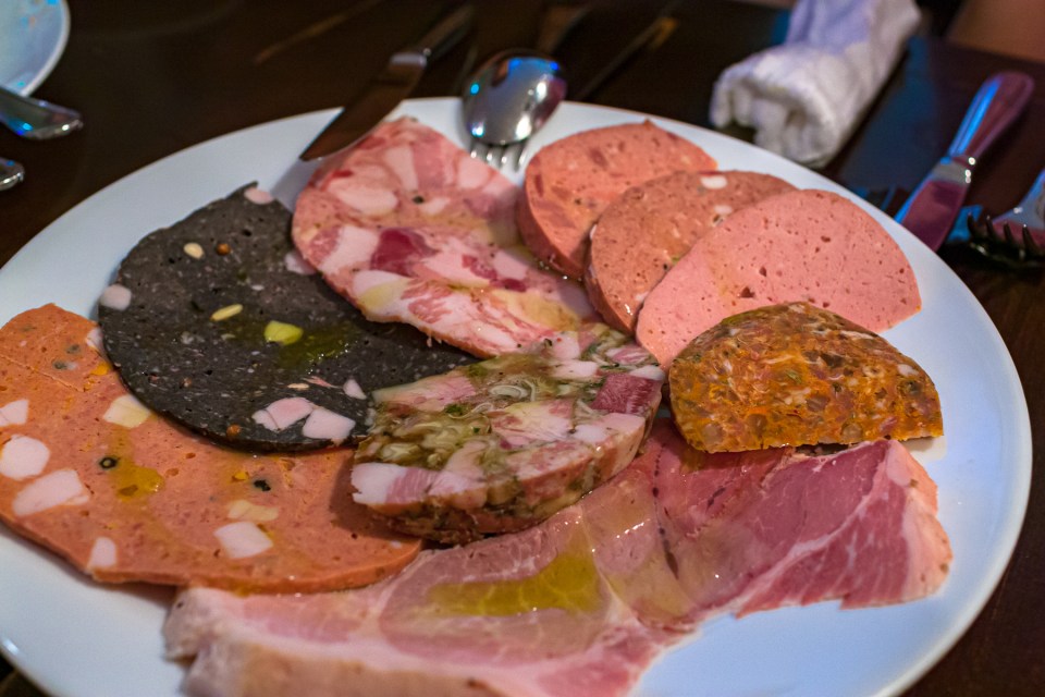 サービスですと,サラミ,スペック,生ハムの盛り合わせが。