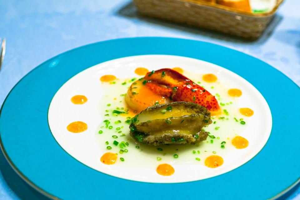 一皿目の前菜です。鮑,オマール,帆立貝。このお店の鉄板の組み合わせです。そして,この澄んだソース。ずっと変わらない味です。少しだけ,ソースでプレート上に描くところは進化しています。