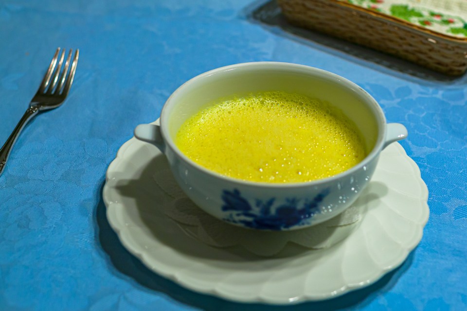 とうもろこしのスープ。とても濃いスープです。とうもろこしをそのまま食べているような気になります。