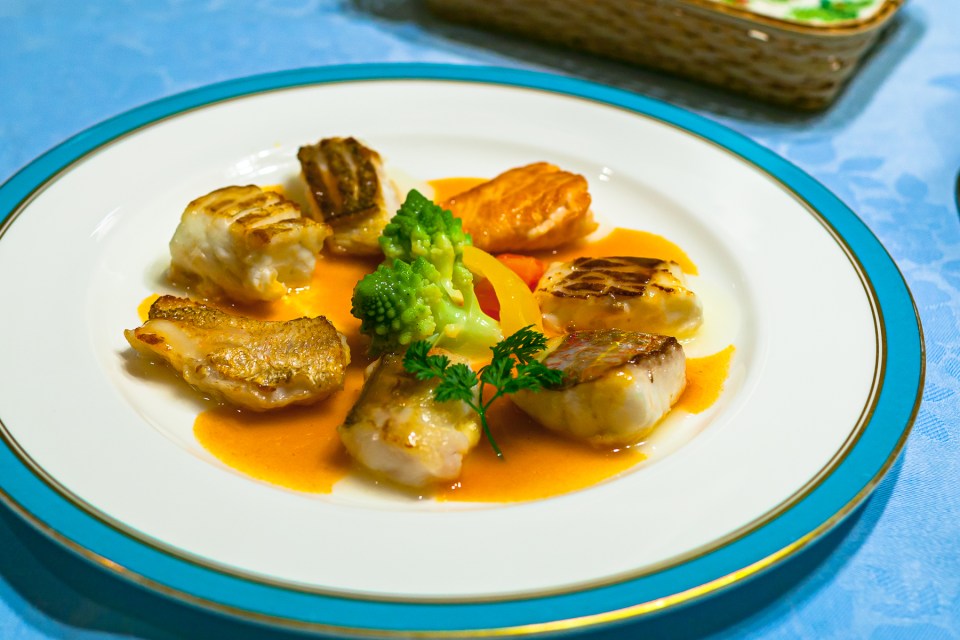 魚料理。ノドグロを初めとする,様々な一口サイズの白身魚。ソースは,ブイヤベースを煮詰めたような魚介類のおいしさが凝縮されたもの。一口ずつなので,味の変化が楽しめます。見た目の良いし,素晴らしい一皿です。
