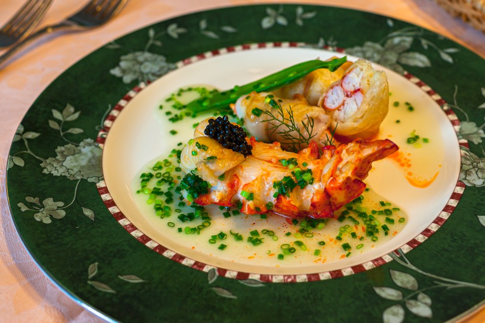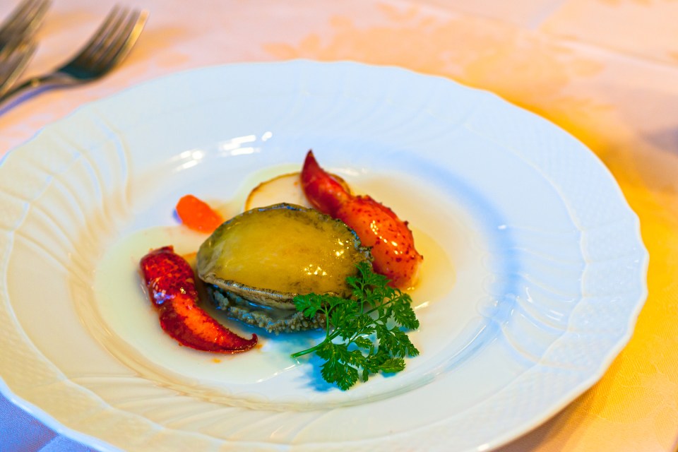 こちらのお店の前菜の定番の組み合わせ,鮑,オマールそして帆立。アクセントに魚卵が添えてあります。今回も,安心できるおいしさです。