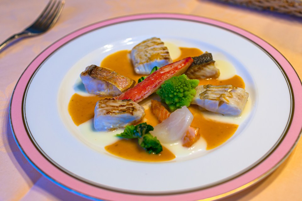 そして今回もロマネスコを中心に,6種類の白身魚のソテー。少しお魚が変えてあります。鮭がおいしいです。添えてある野菜ともよく合います。