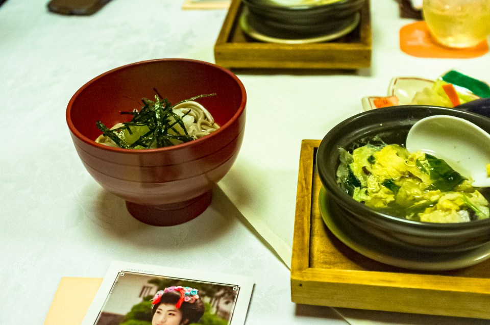 炊き合わせは柳川風。〆のご飯はお蕎麦です。酒井製麺の蕎麦でしょうね。