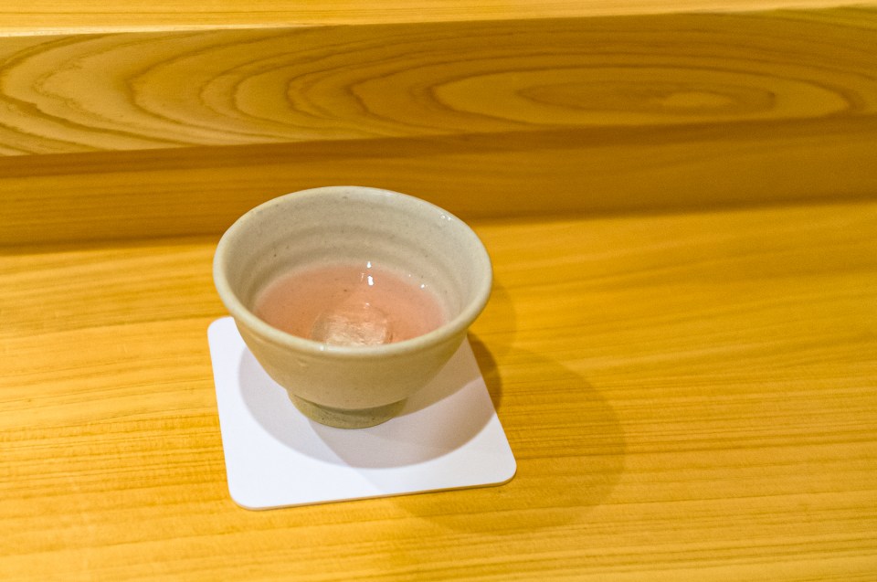 食前酒として盃に日本酒が注がれます。歩いて来ているので,飲んでも構いません。おいしくいただきます。