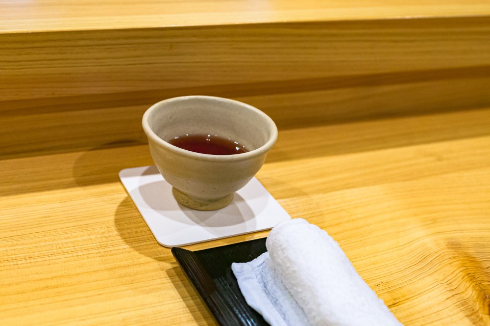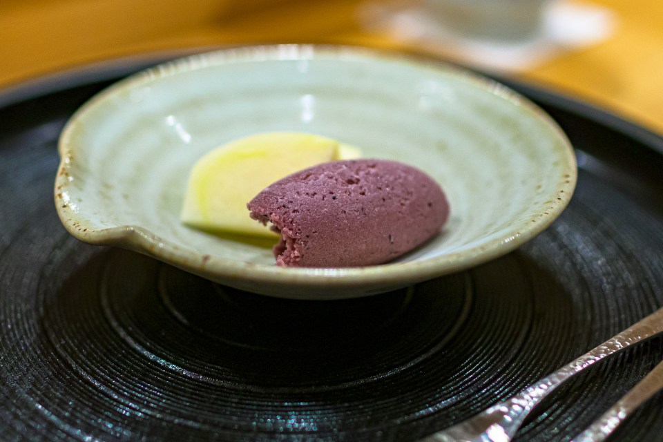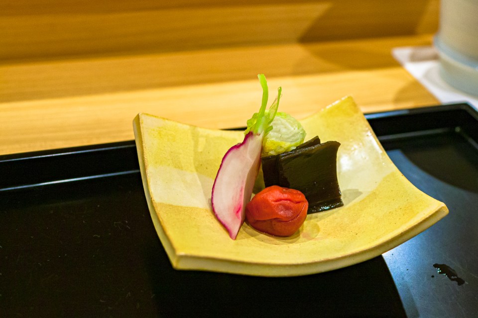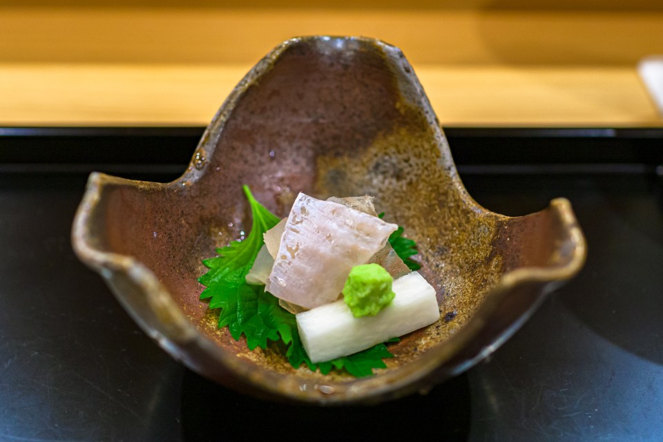 向う付け2皿目は平目の昆布〆。昆布の出汁がいい塩梅で染込んで,いい味に仕上がっています。