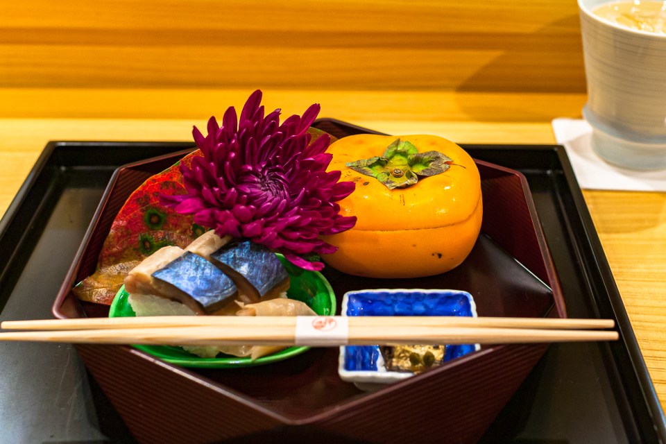 先付けのこのセッティング。秋らしい,素敵な色彩ですね。菊の花の色,そして柿の葉の色。最高です。