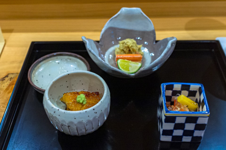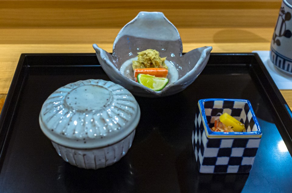 先付けの3品。手前から穴子飯,なます,庄内浜でとれたズワイガニ。