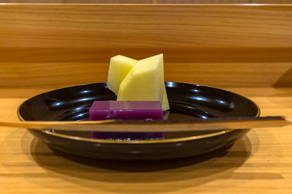 そして最後の水菓子は紅いも羊羹と富士林檎。