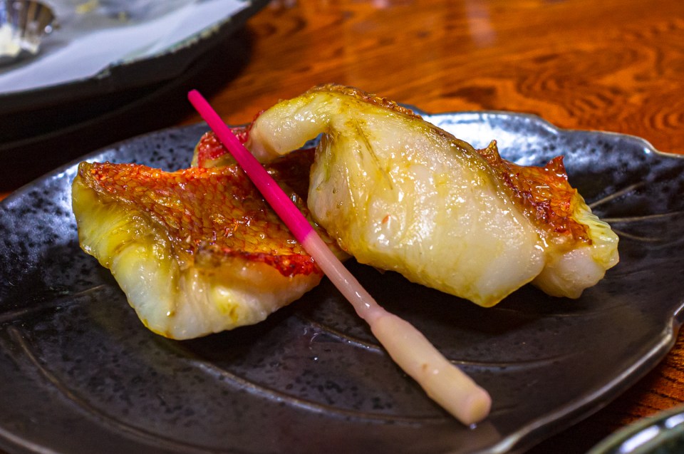 焼物はキンキ。あまり脂が載っていません。焼き加減も上手ではなく,折角のキンキがもったいないです。