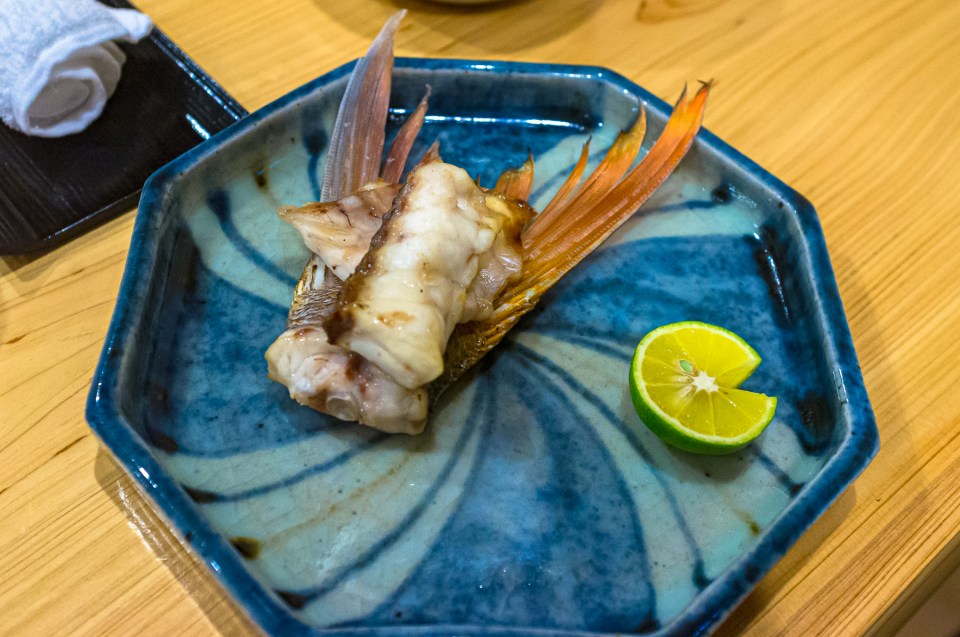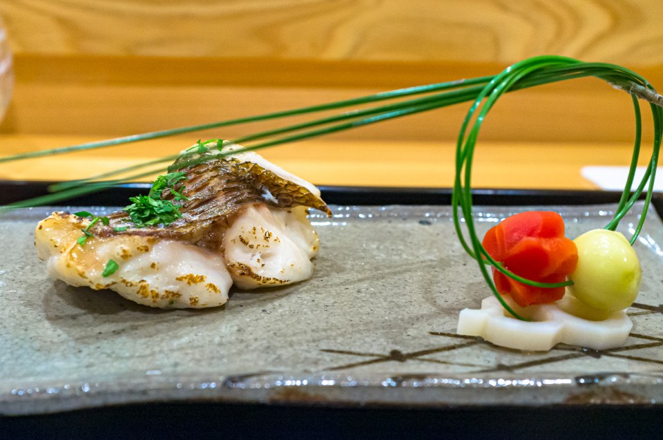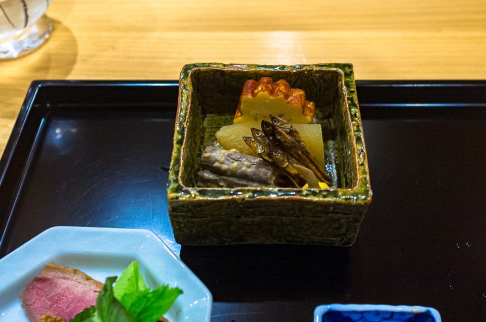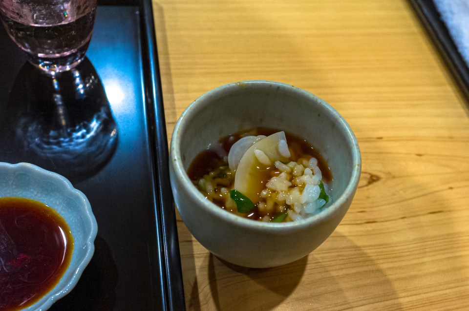 このなかでは、ねっとりしたアオリイカも良かったのですが、タラコを身にまとった庄内浜の平目の混布〆が思わぬ組み合わせでそのおいしさに驚いています。