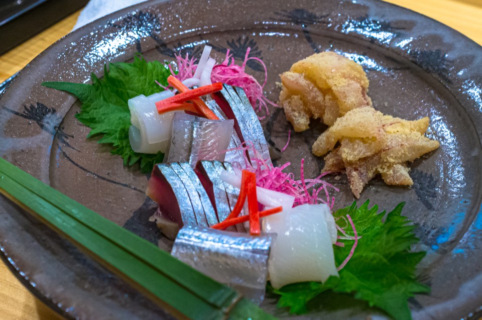 .向う付けは〆さば、細魚、アオリイカ、庄内浜の平目のこぶ締めにタラコを塗したもの。