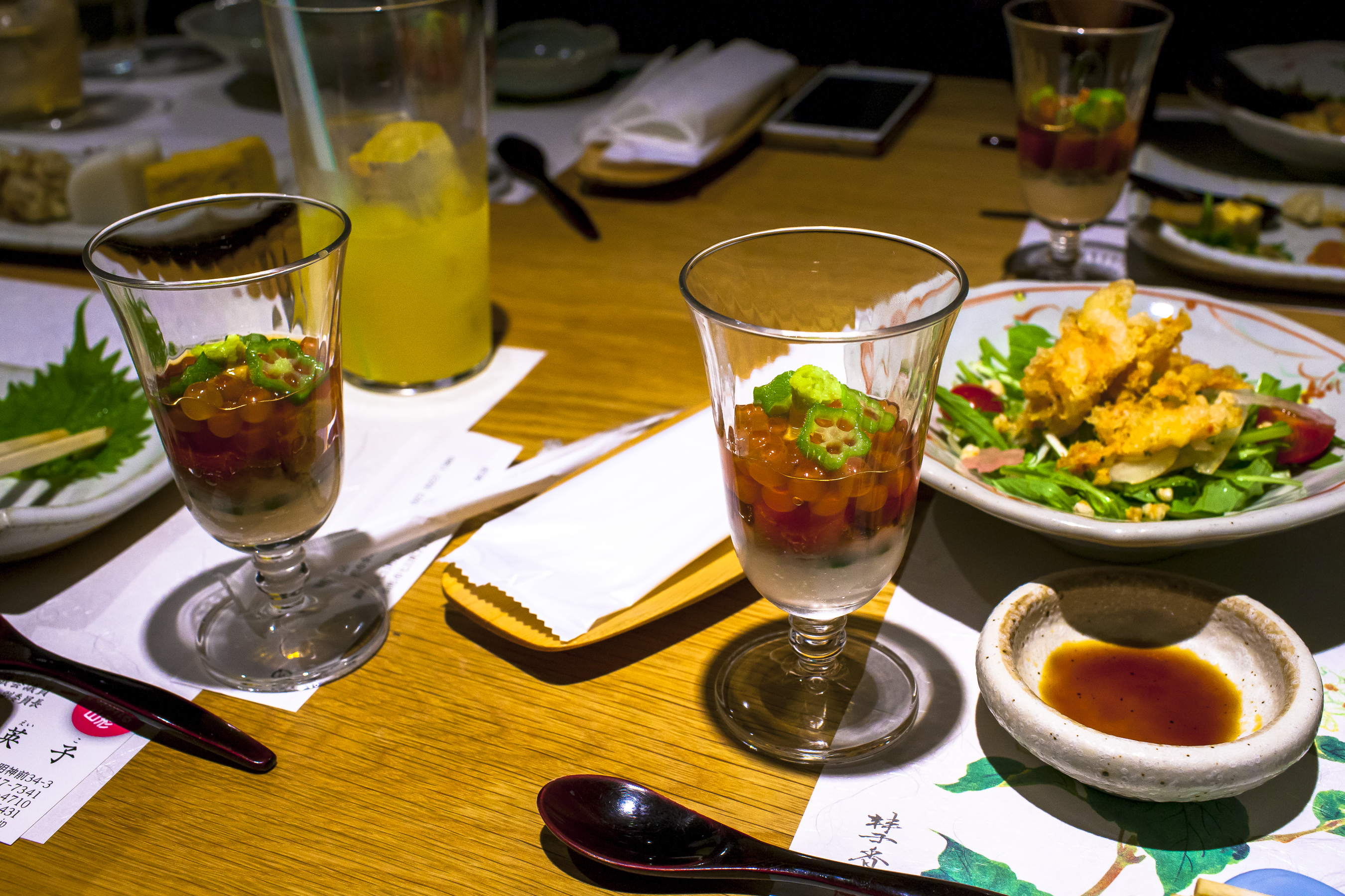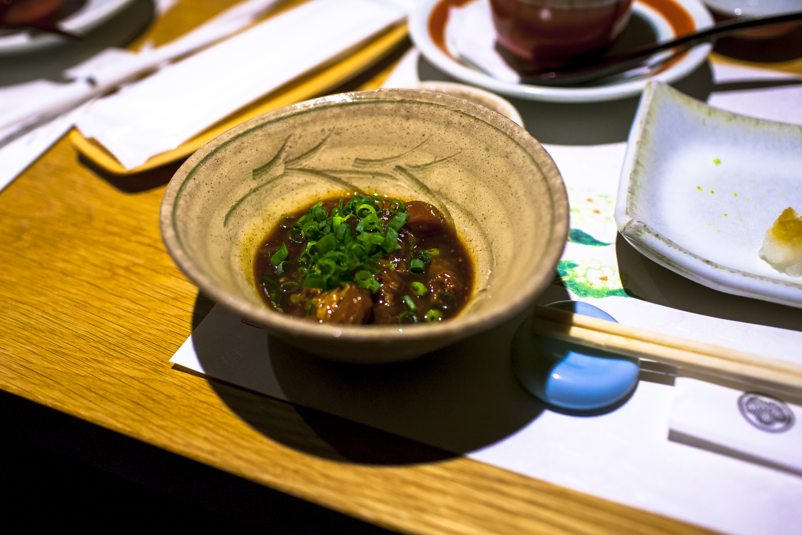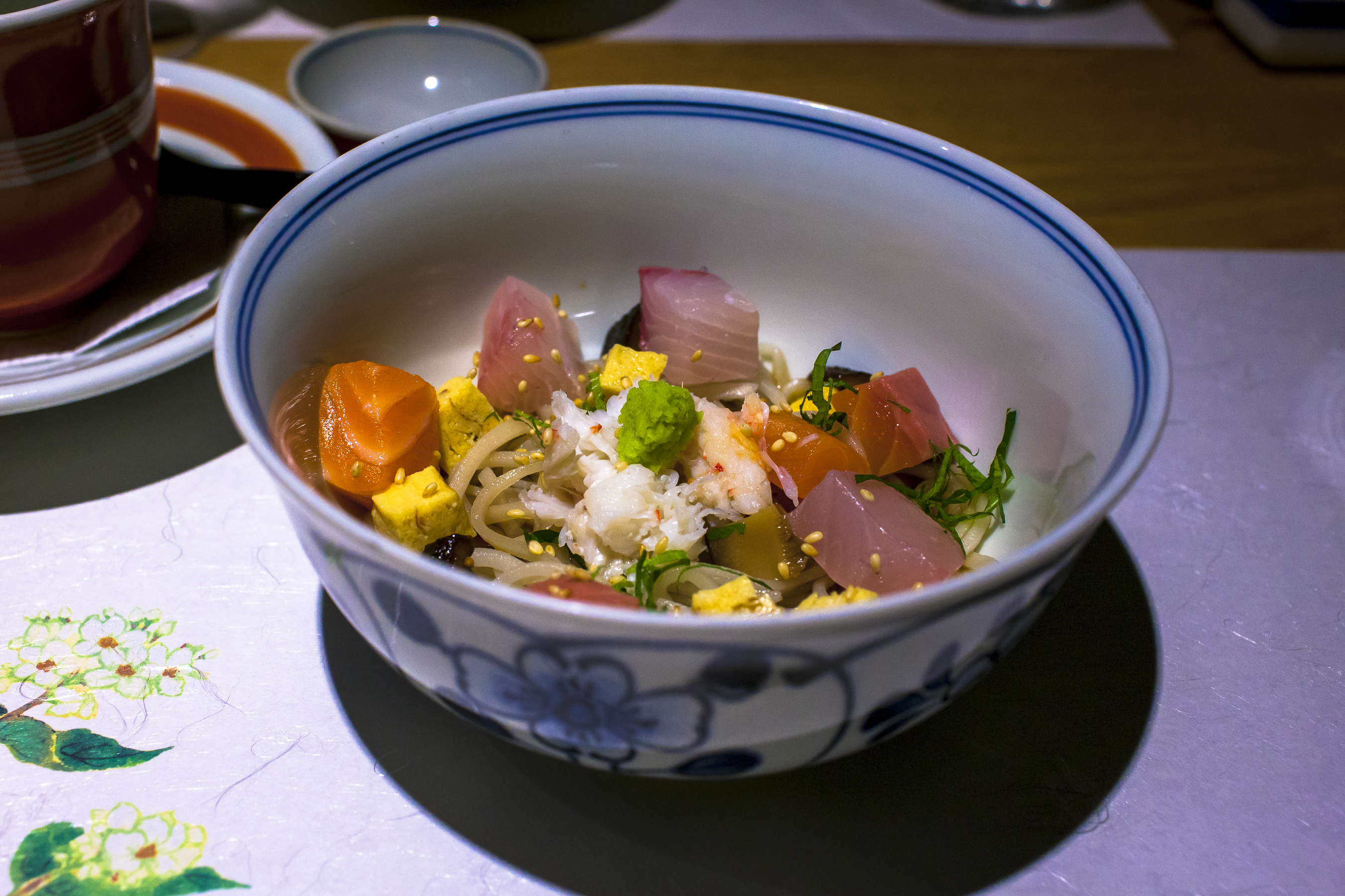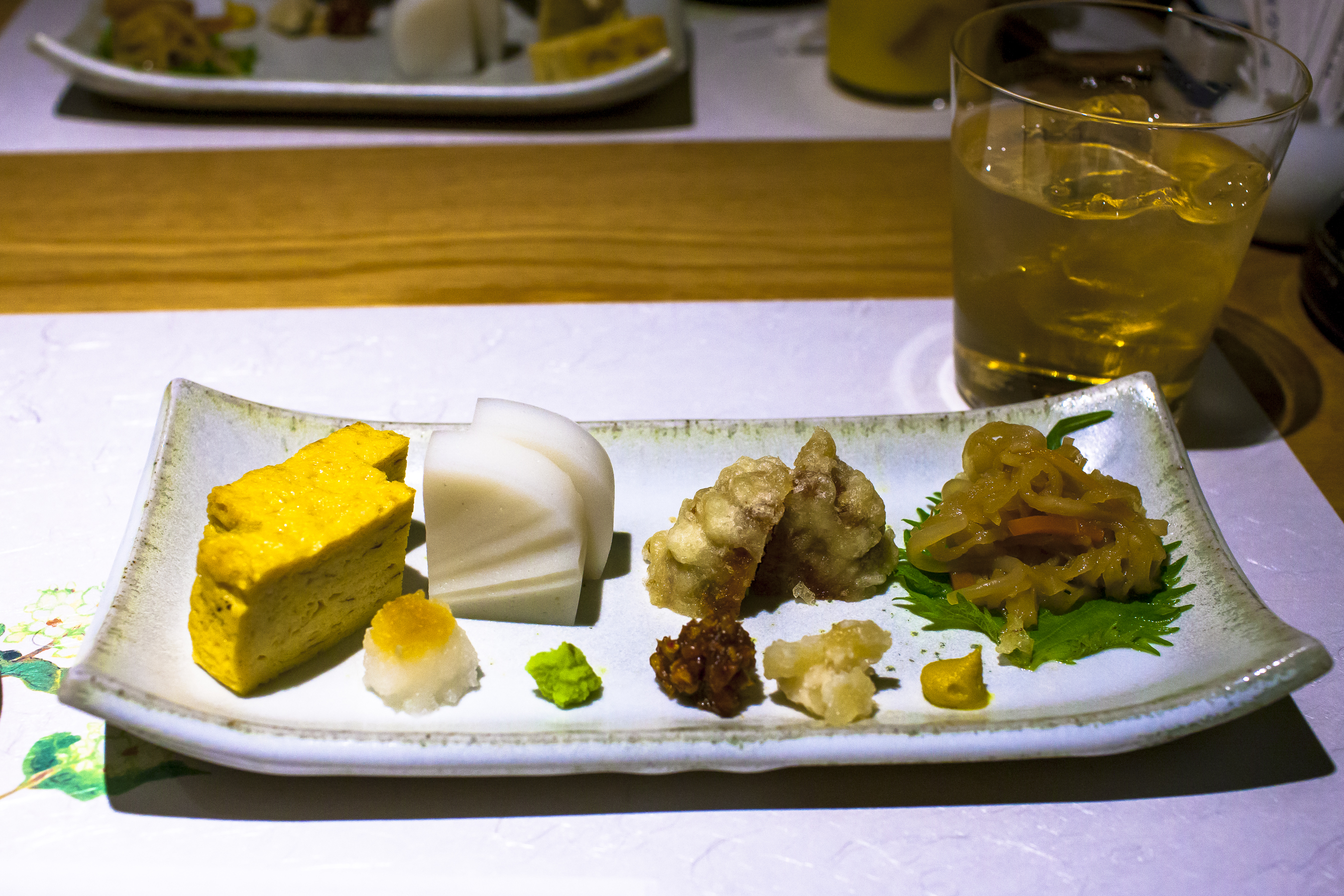 先付は前回と同じお酒に好適なつまみが並びます。だし巻き卵、鳥団子、板わさ、蕎麦の実、切り干し大根。
