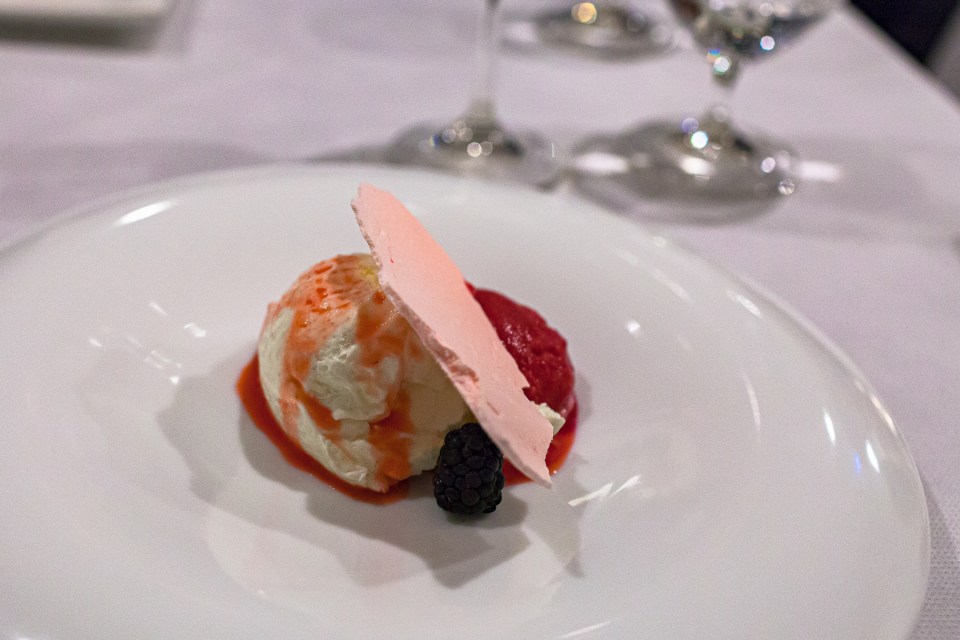 デセールはフランボワーズのアイスクリームと生クリームとイチゴのメレンゲ。それとラズベリー。