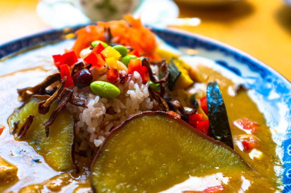 ご飯が古代米のこだわり。そして、いろんな野菜の素揚げが良いアクセントになっています。