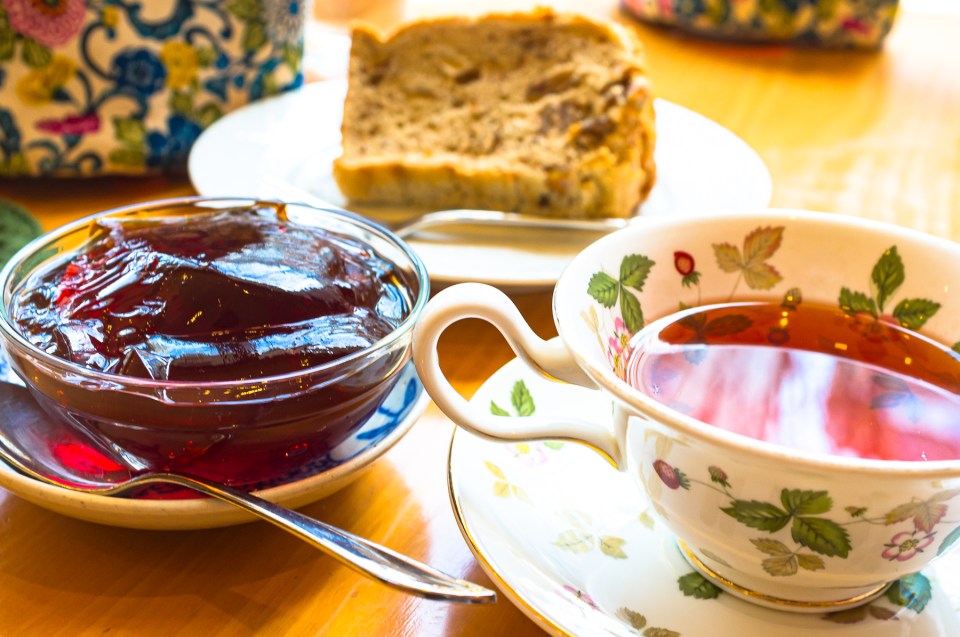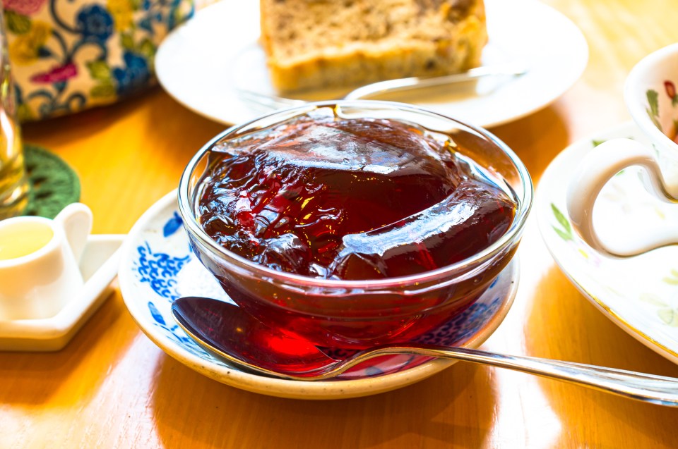 紅茶の他にもティーゼリーを頼みます。黒糖とクルミを使ったシフォンケーキも。