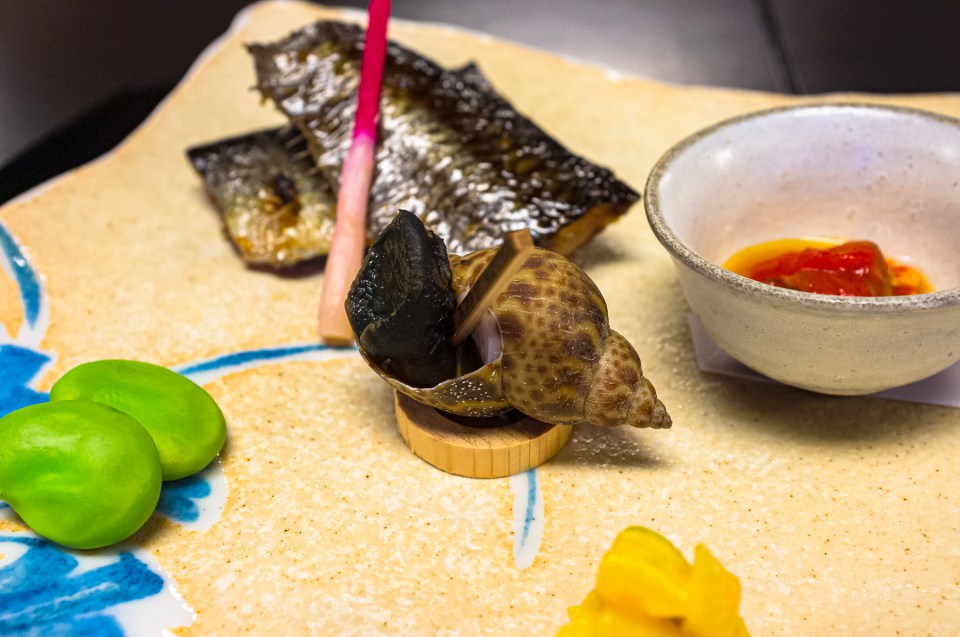 先付は、空豆、身欠きにしん、バイ貝。安心できるおいしさです。