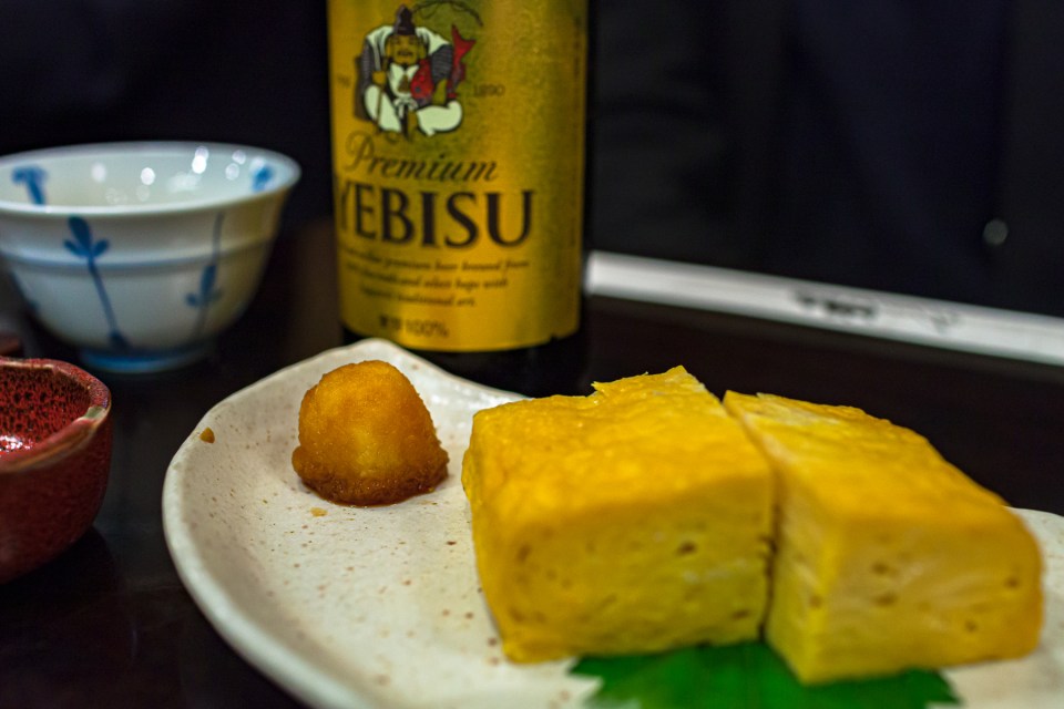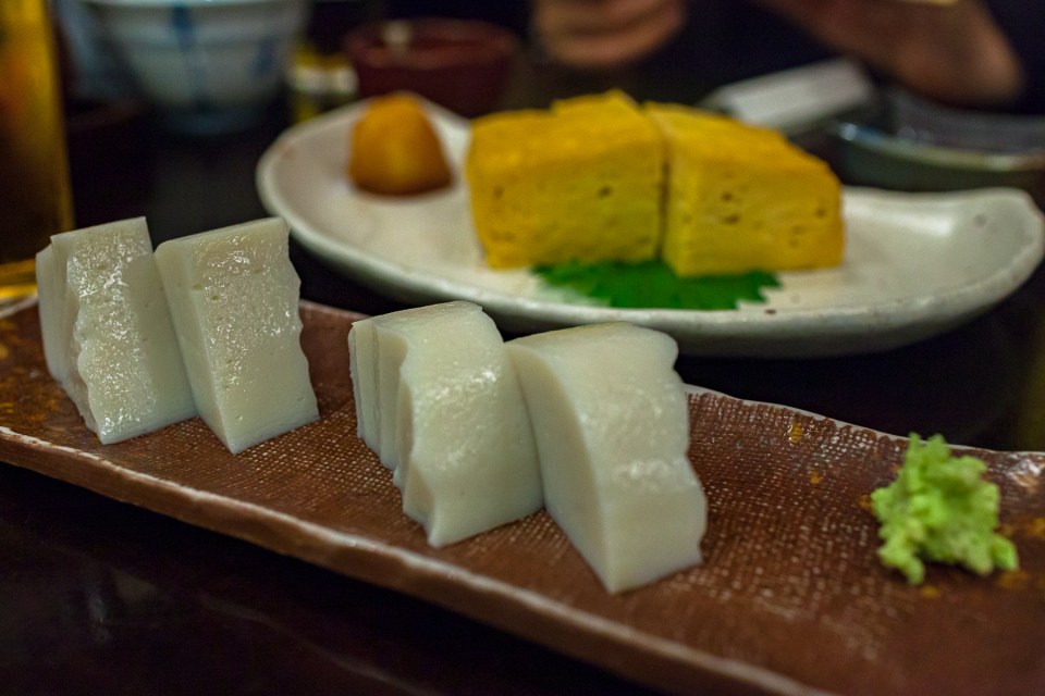 肴は板わさと厚焼き玉子。そして、お通しの鯛味噌がおいしい。