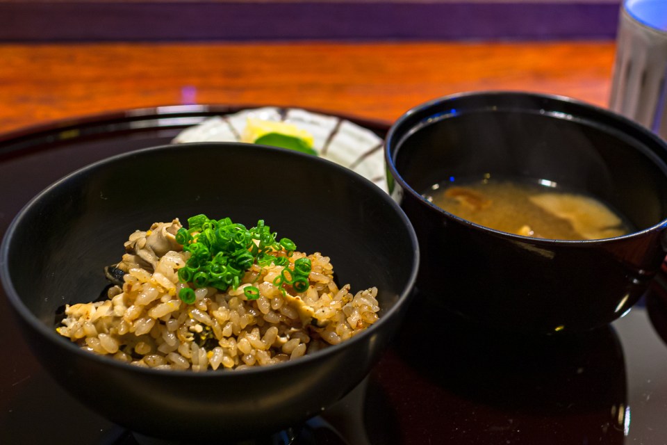 牡蠣を一回炊いて、そのお出汁を使ってお釜で炊き上げたご飯。