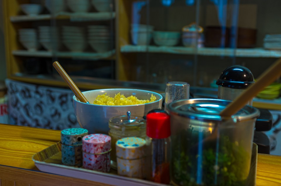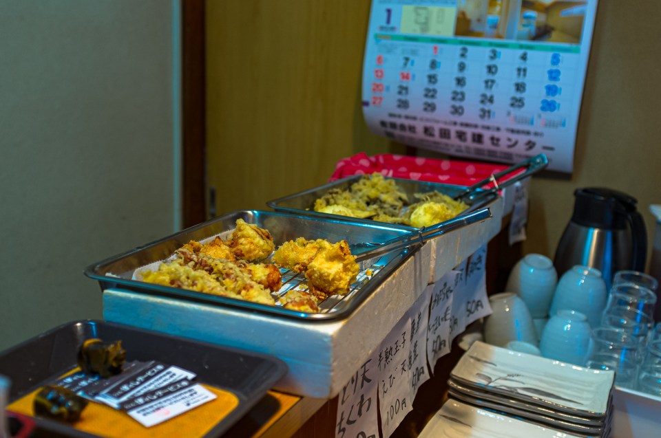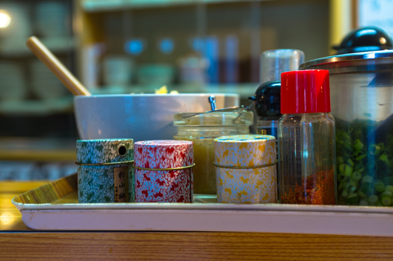 天かす、刻んだ九条ネギ、山椒などが並んでいます。