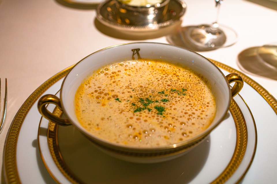 . 前菜 渡り蟹のスープ、カプチーノ仕立て