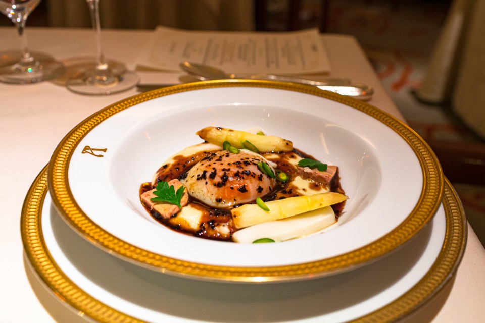. 前菜 卵のパルフェとホワイトアスパラガスのクゥーリ ペリグーソース