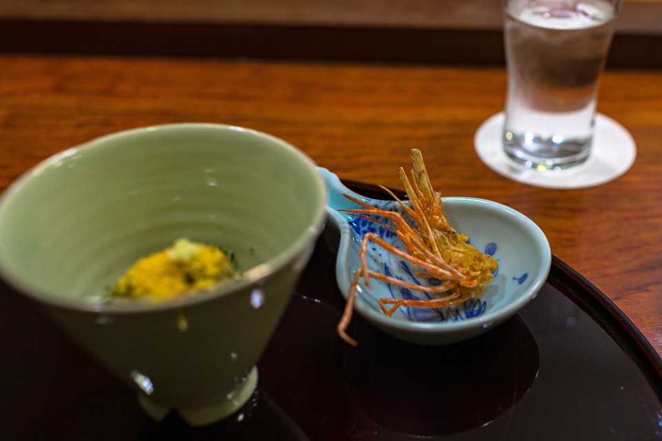 . お凌ぎ 牡丹海老の小丼、唐墨と塩昆布載せ