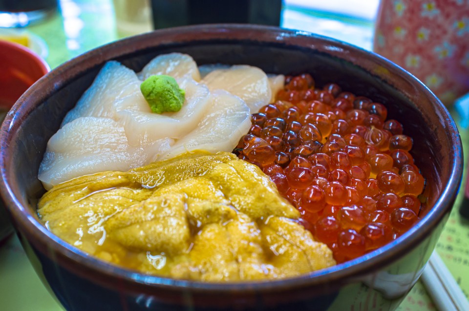 いくら、雲丹、帆立の3種類が巴状に敷きつめられた海鮮丼です。