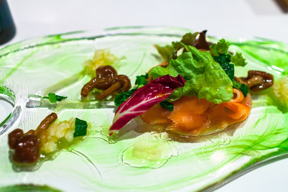 スモークサーモンの何を引きたてたくてのなめこなのでしょうか。