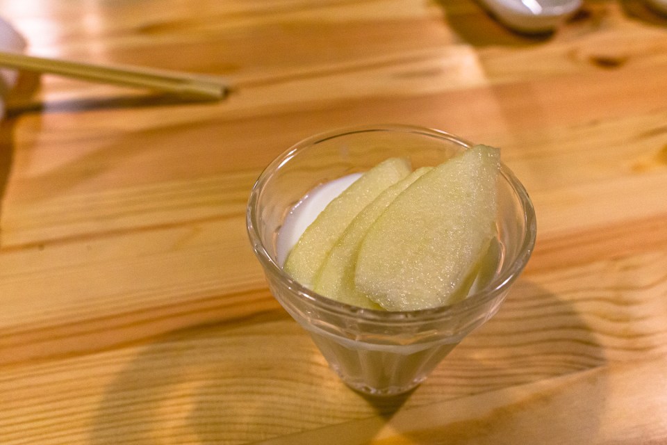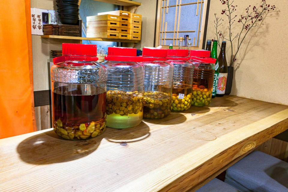 カウンターには、果実酒の瓶が並んでいます。僕はこの中の梅を頼みました。