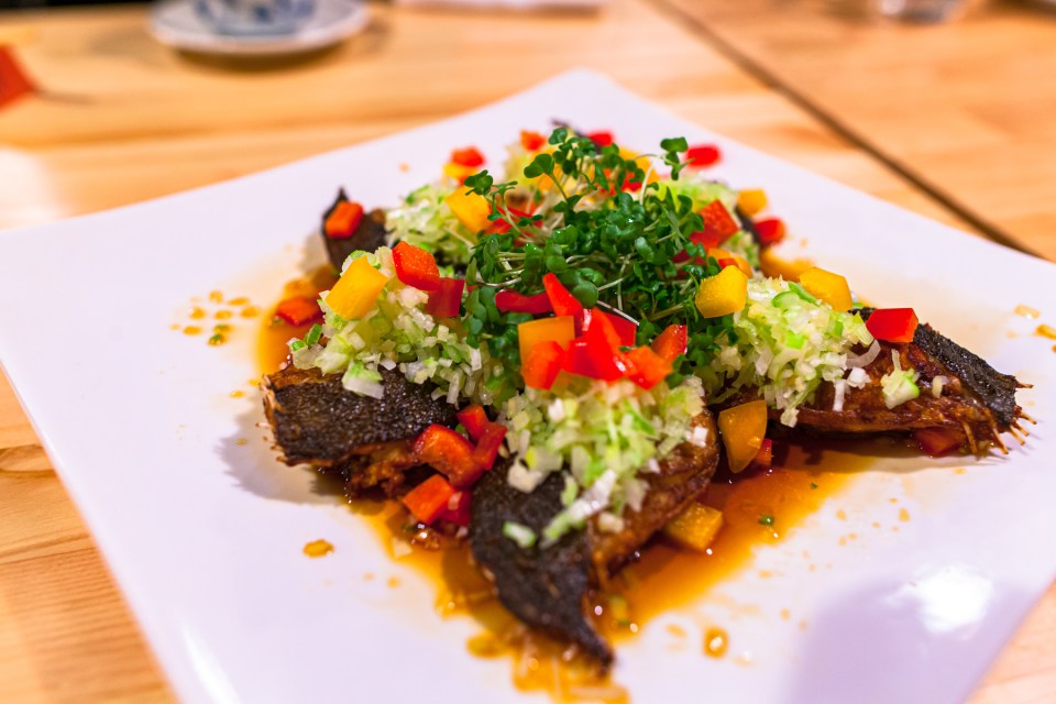 くちぼそ鰈の素揚げ、葱ソース掛け。