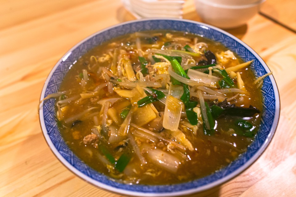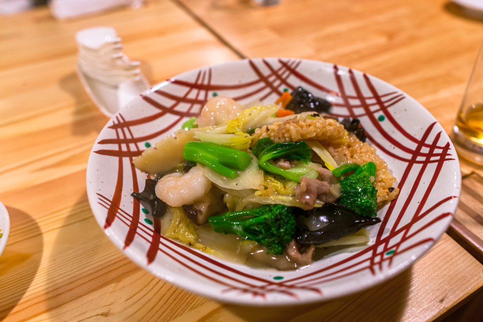 海鮮おこげ、海老炒飯、酸辣湯麺。