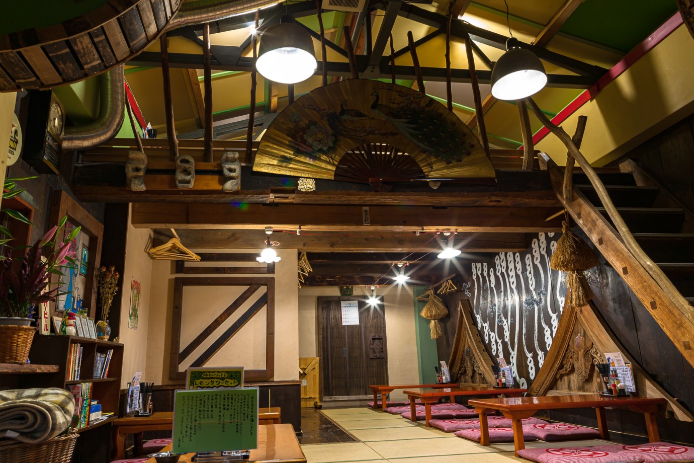 入り口を入ったところのコの字のカウンター空間は、二階までの吹き抜け。