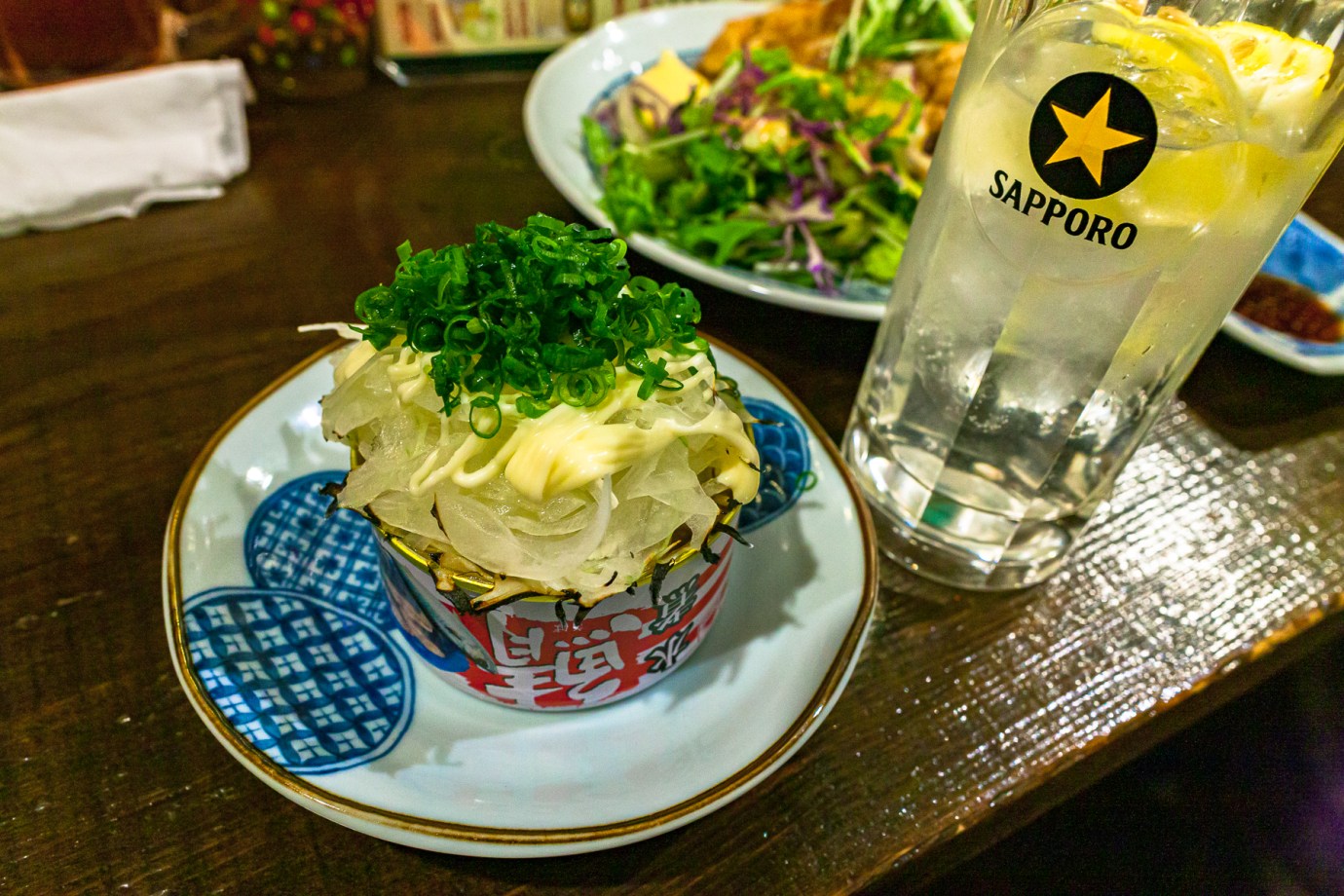 山形県人には堪らない、鯖缶、オニオンスライス、マヨネーズと小葱。
