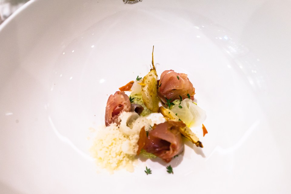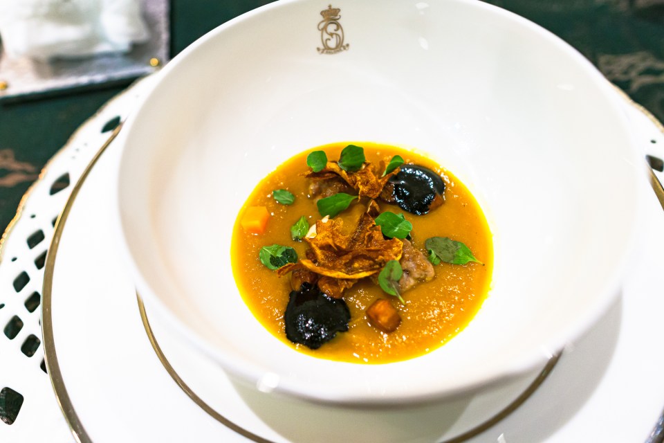 人参のクレマ、烏賊と豚のサルシッチャ クミンとマジョラム
