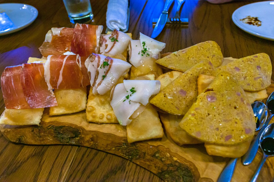 ひよこ豆の揚げパンにラルドやカレー風味のハムを乗せたもの。