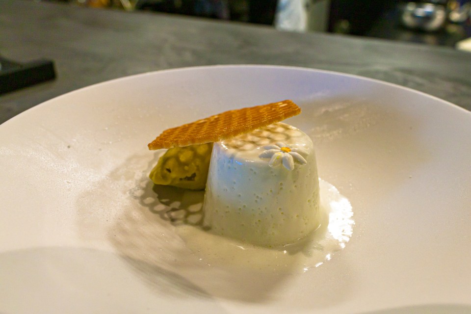 ココナッツミルクを合わせて食べるパンナコッタ。